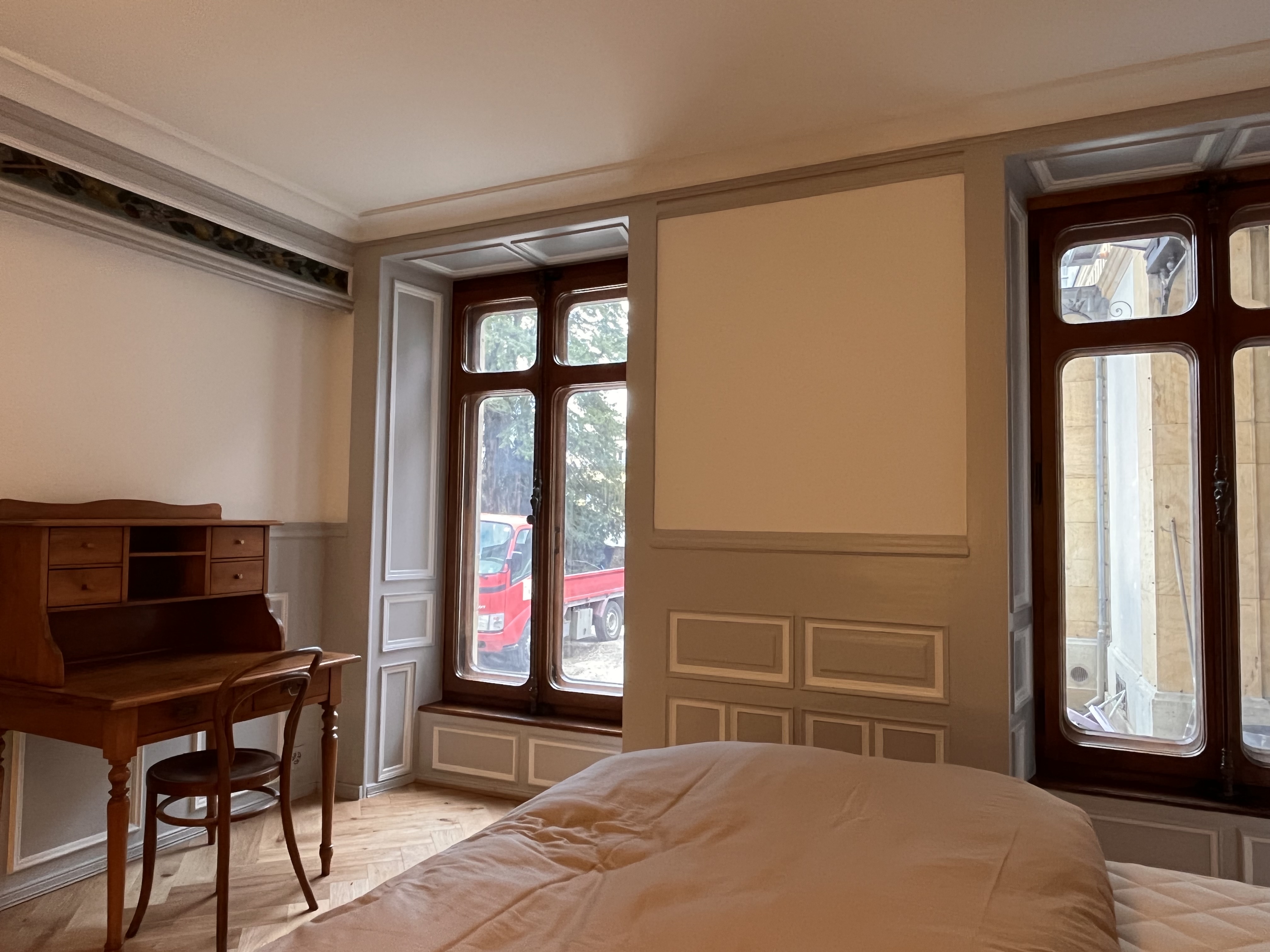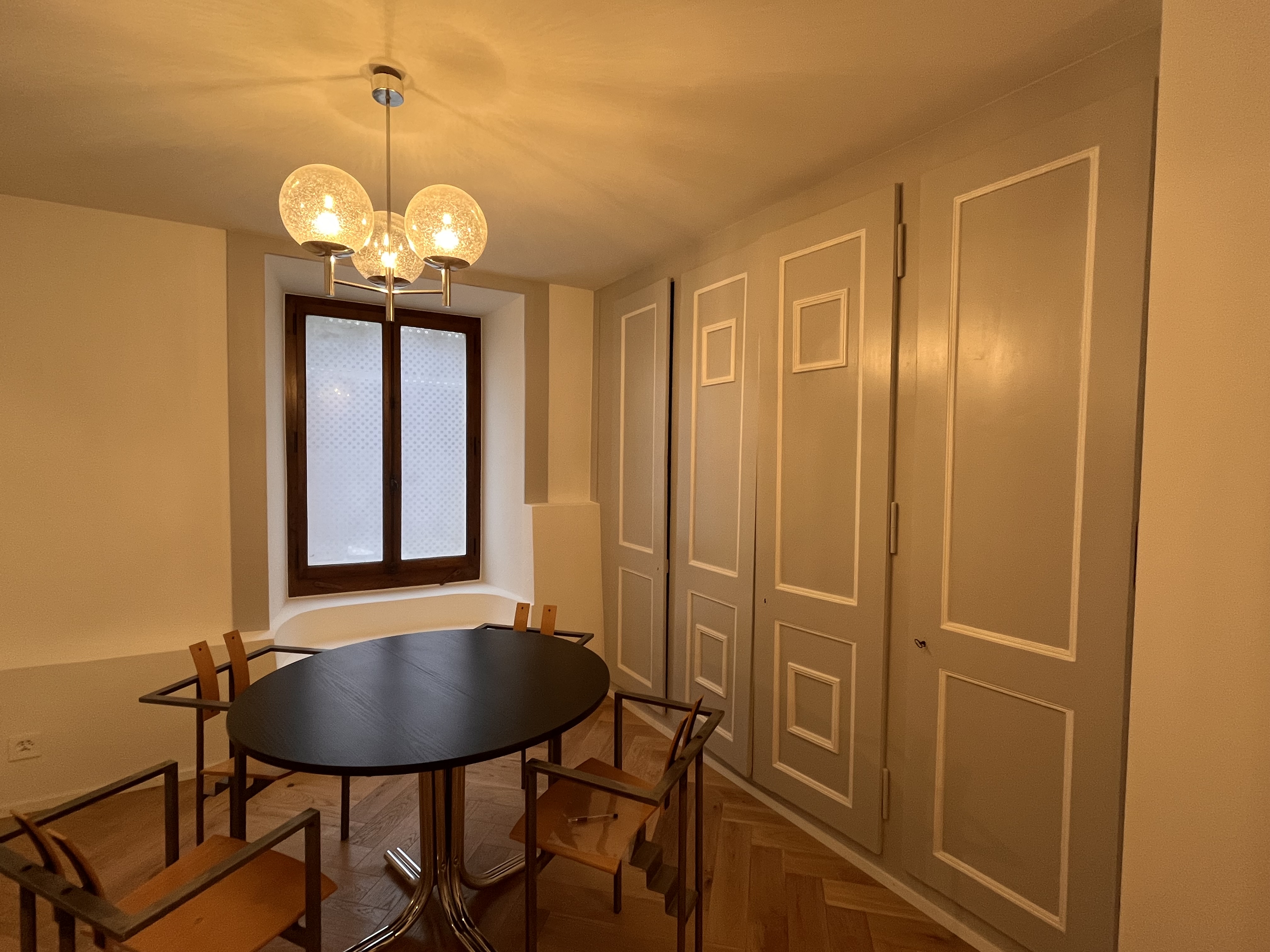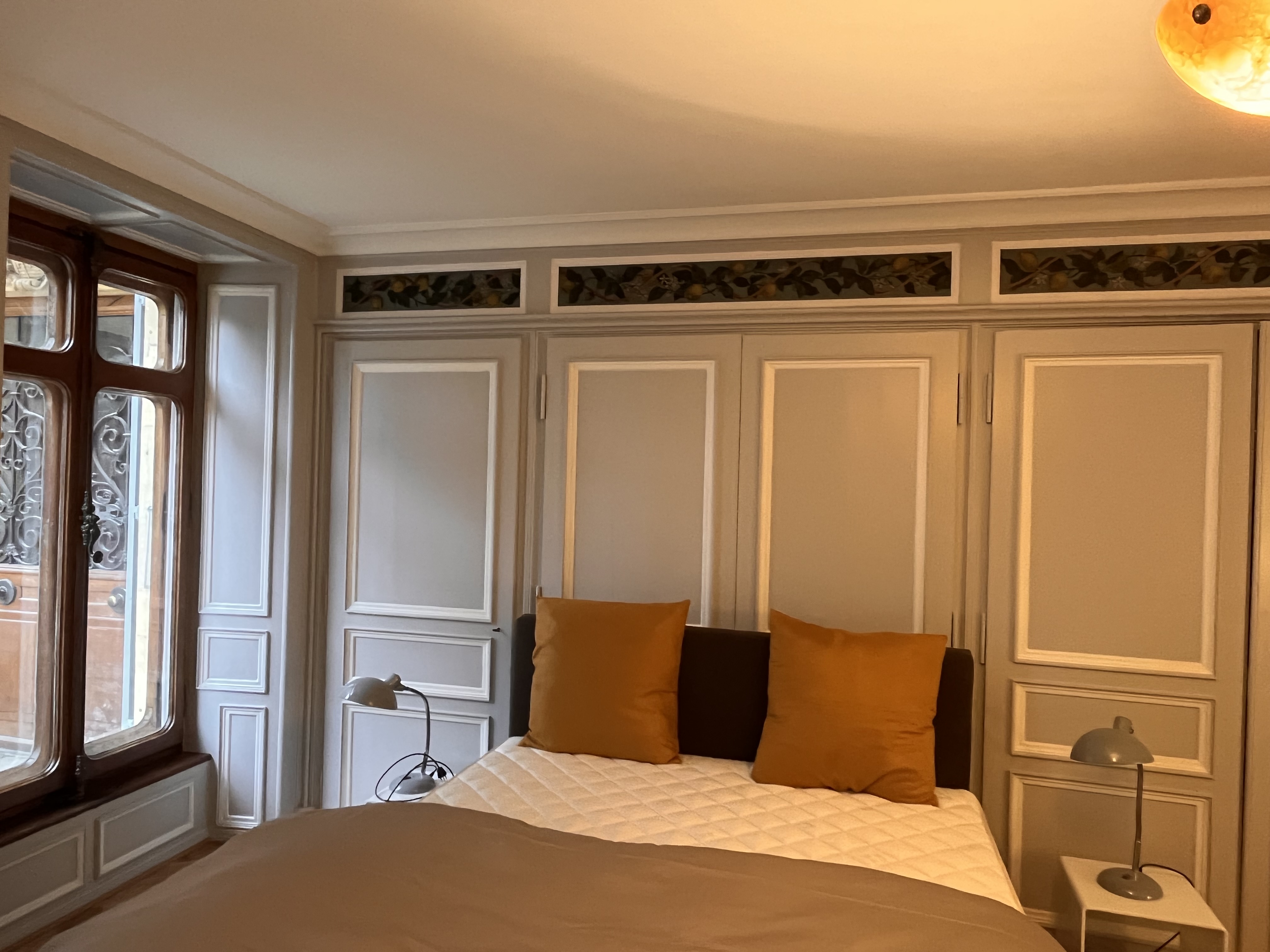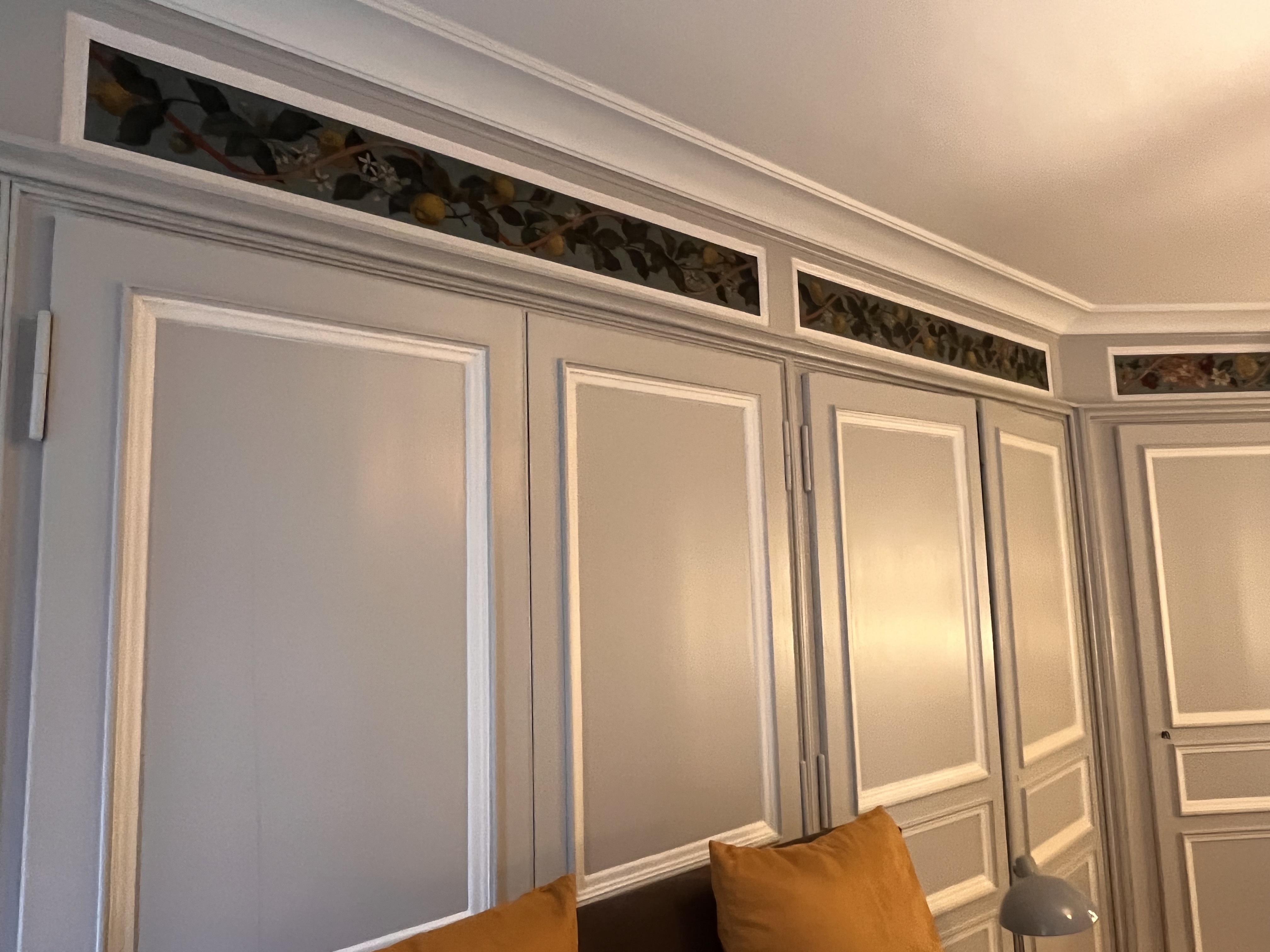 Ses grandes armoires murales ainsi que ses boiseries décoratives lui confèrent un aspect chaleureux et authentique.
