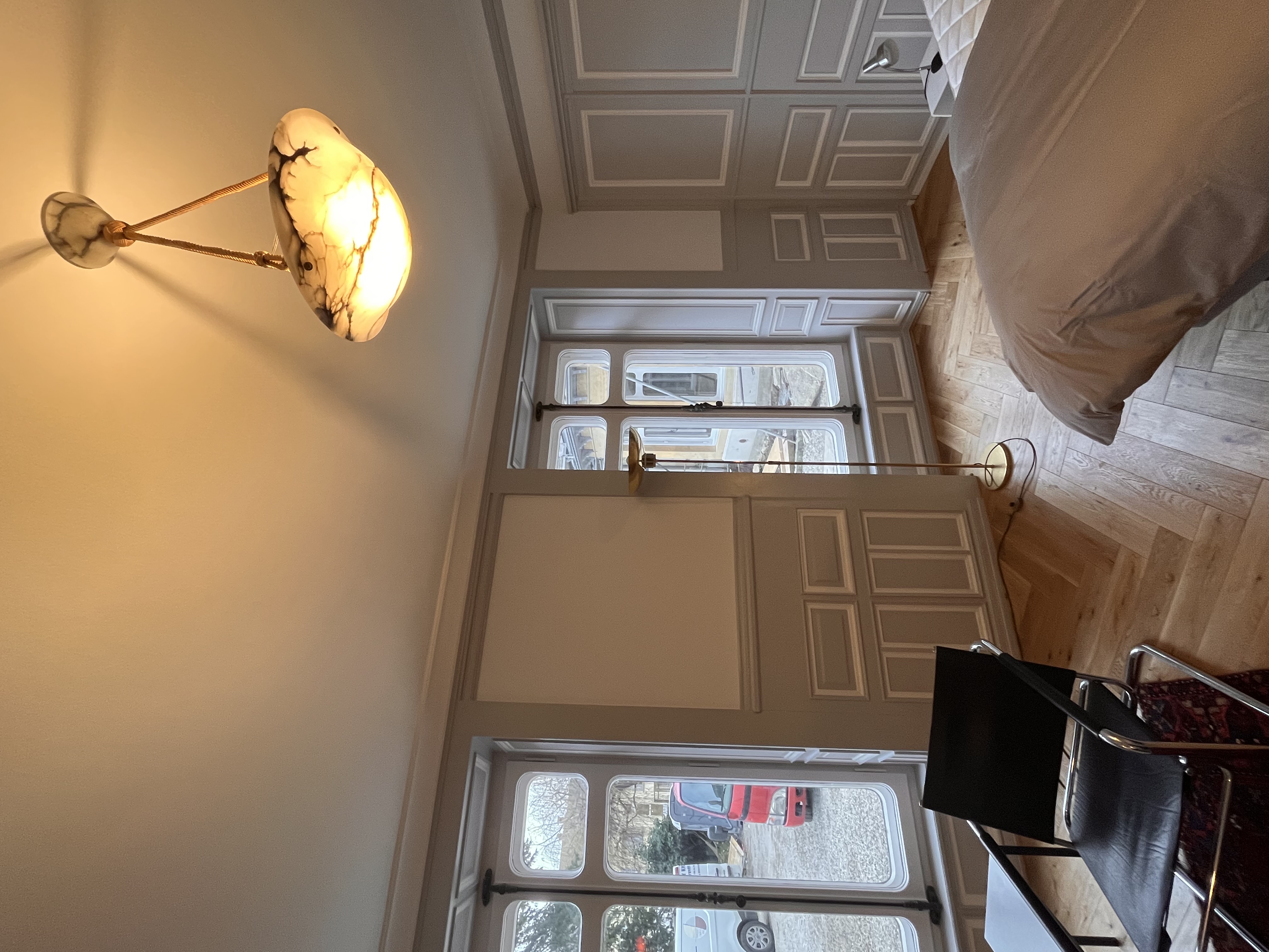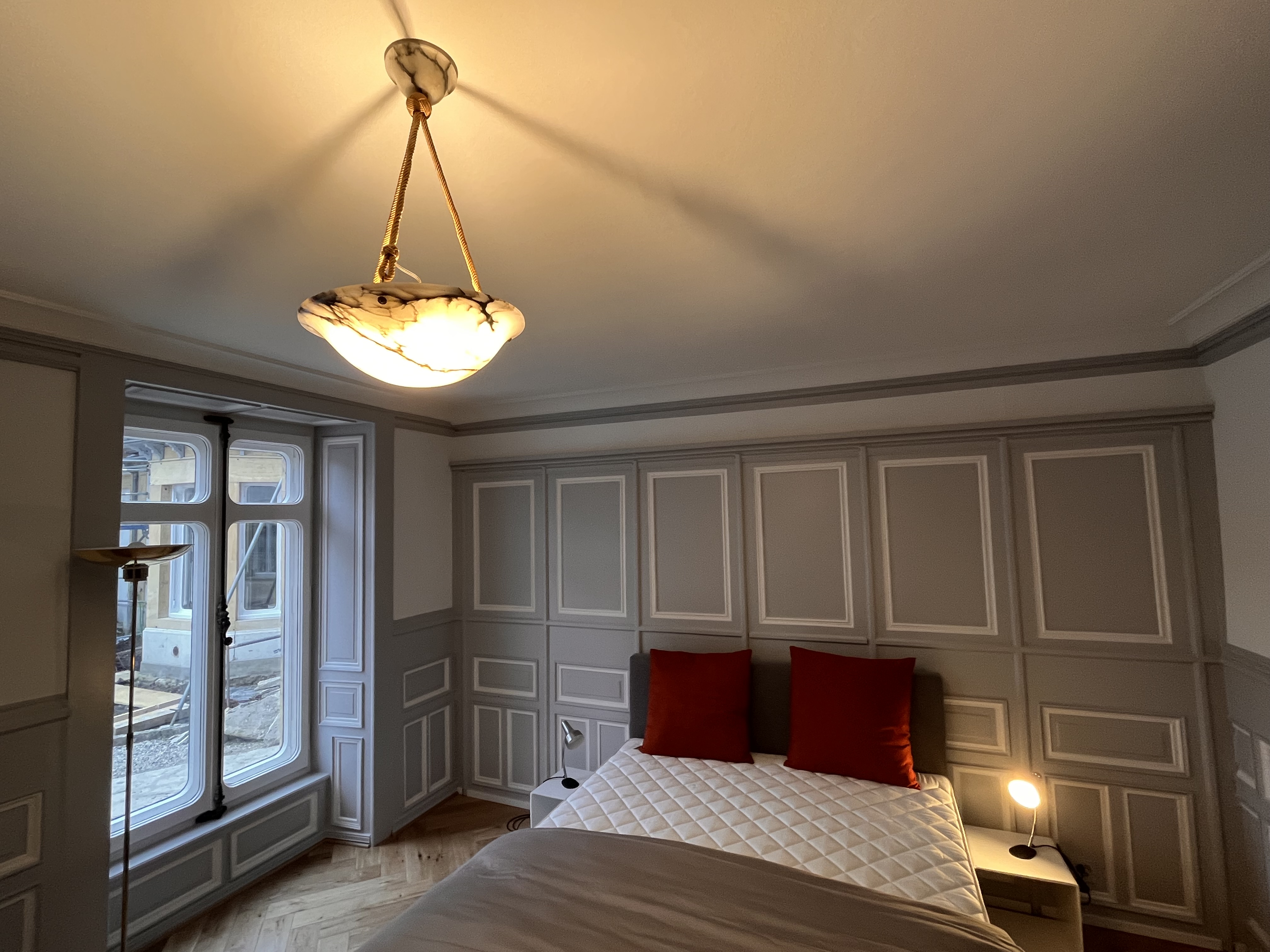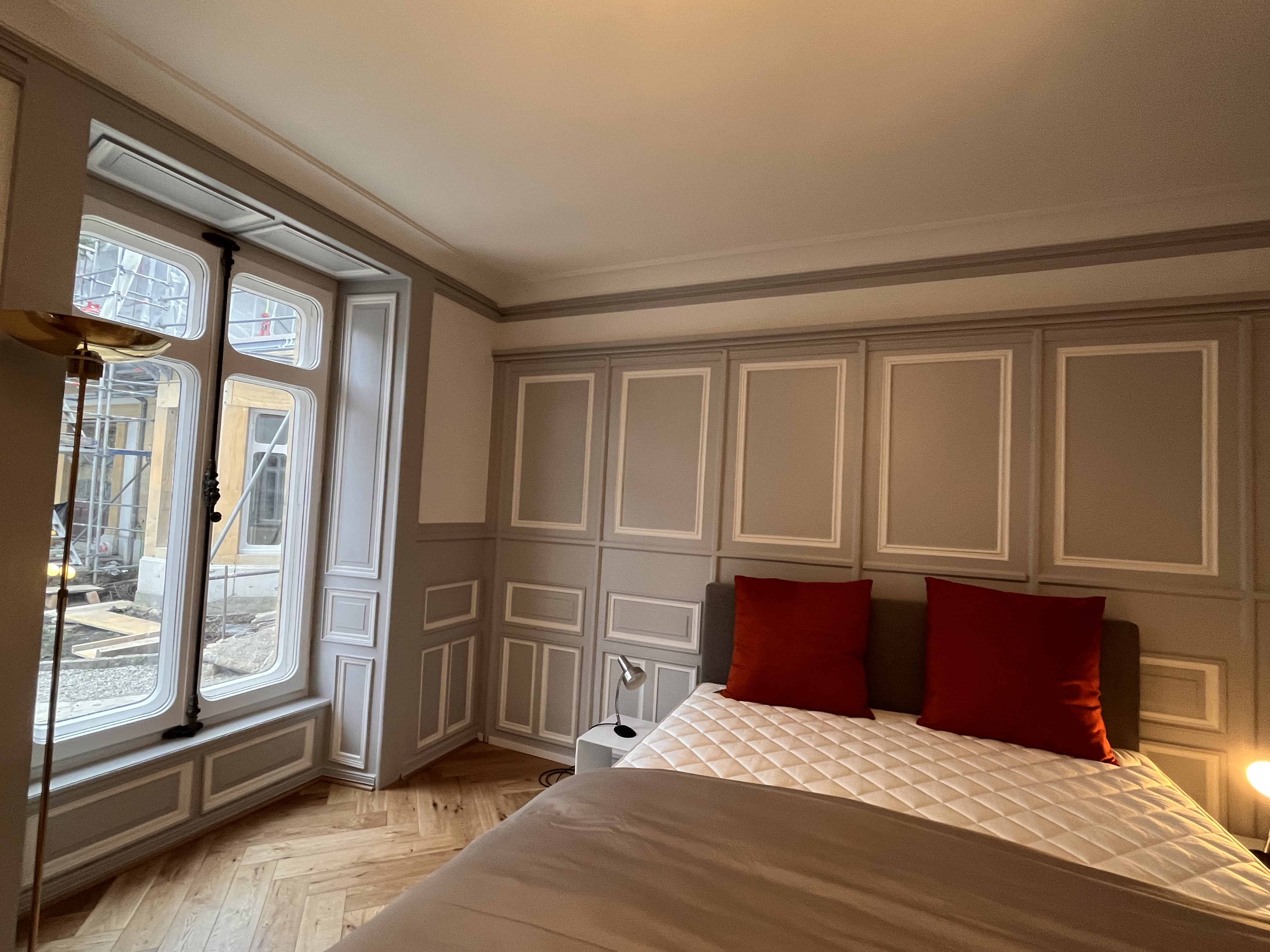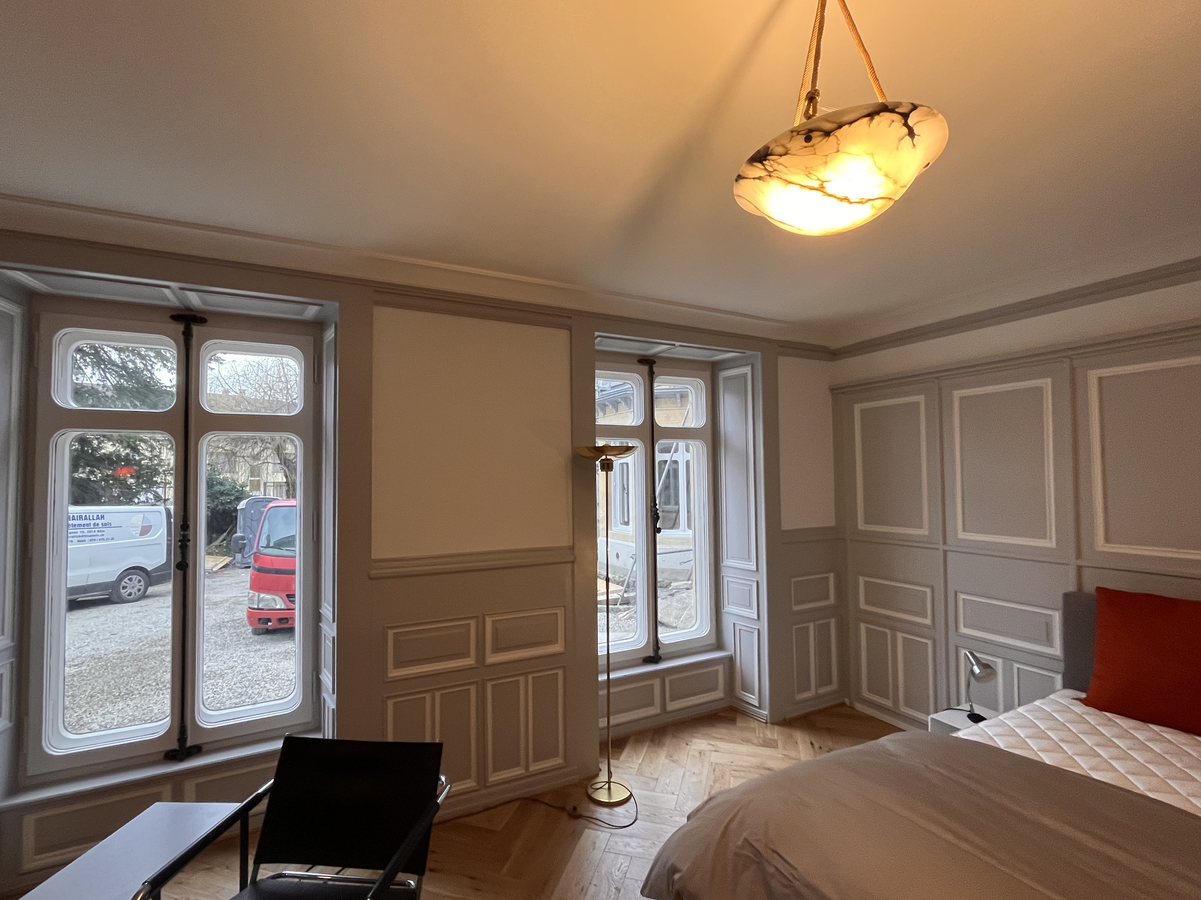 Cette chambre de 20m², aux impressionnantes boiseries décoratives est ornée de peintures d'origines. Une belle cheminée de marbre lui confère un charme d'époque, ses fenêtres lui confèrent une belle luminosité.