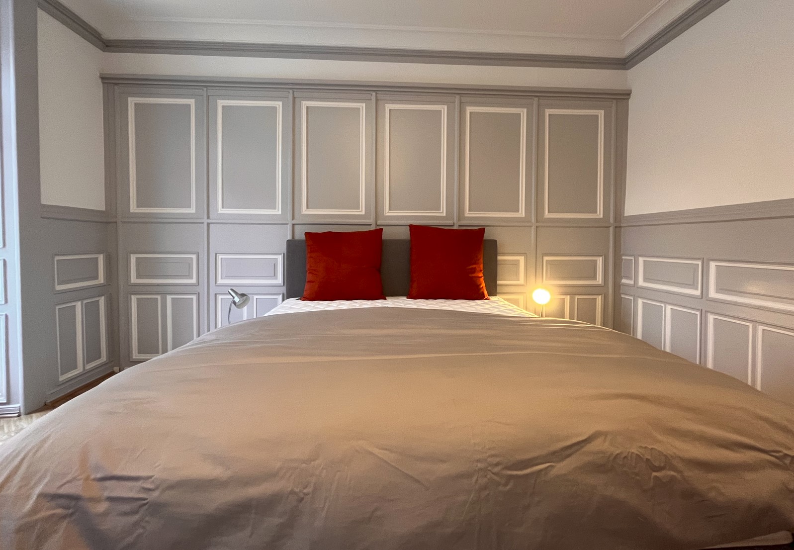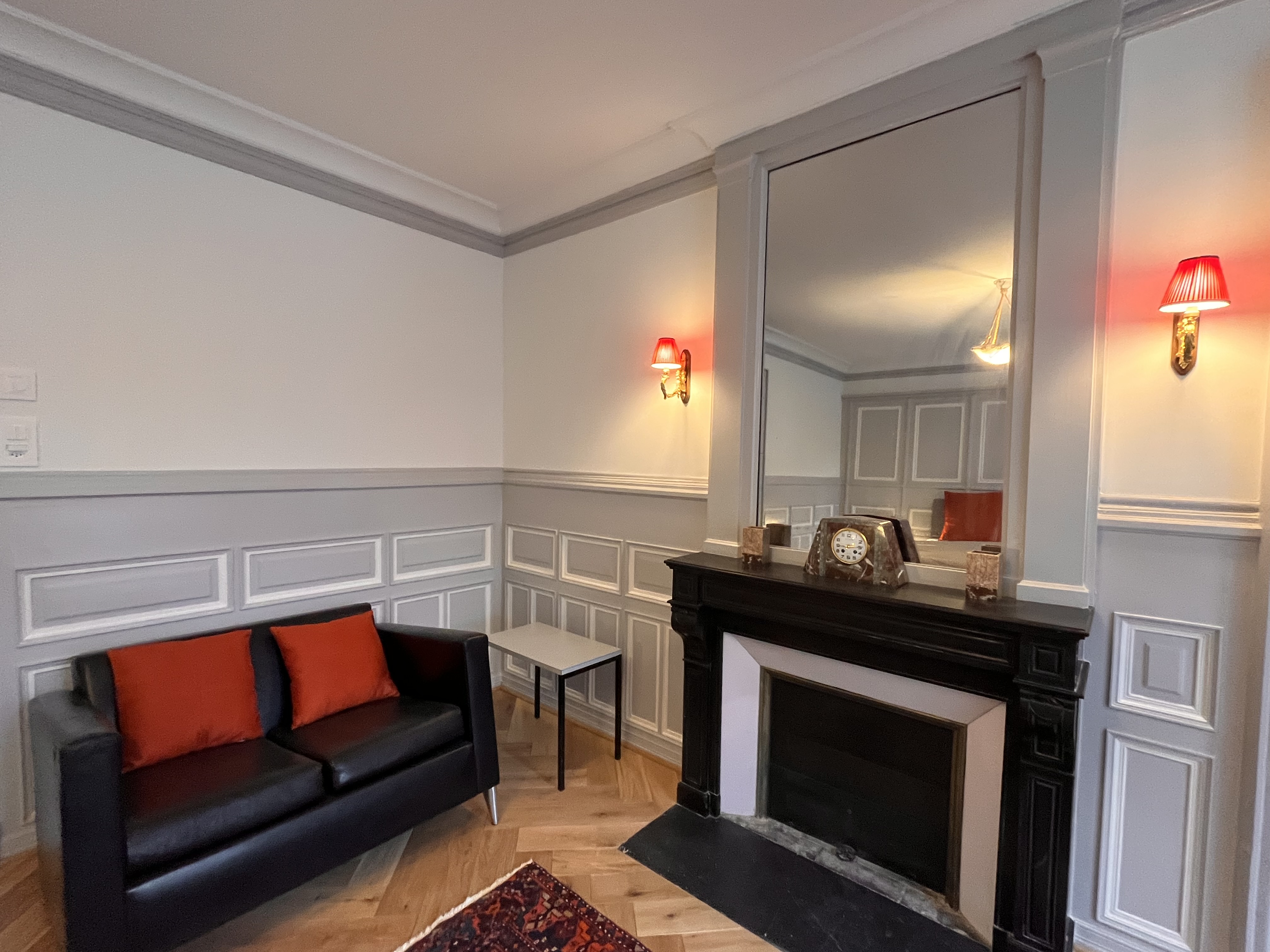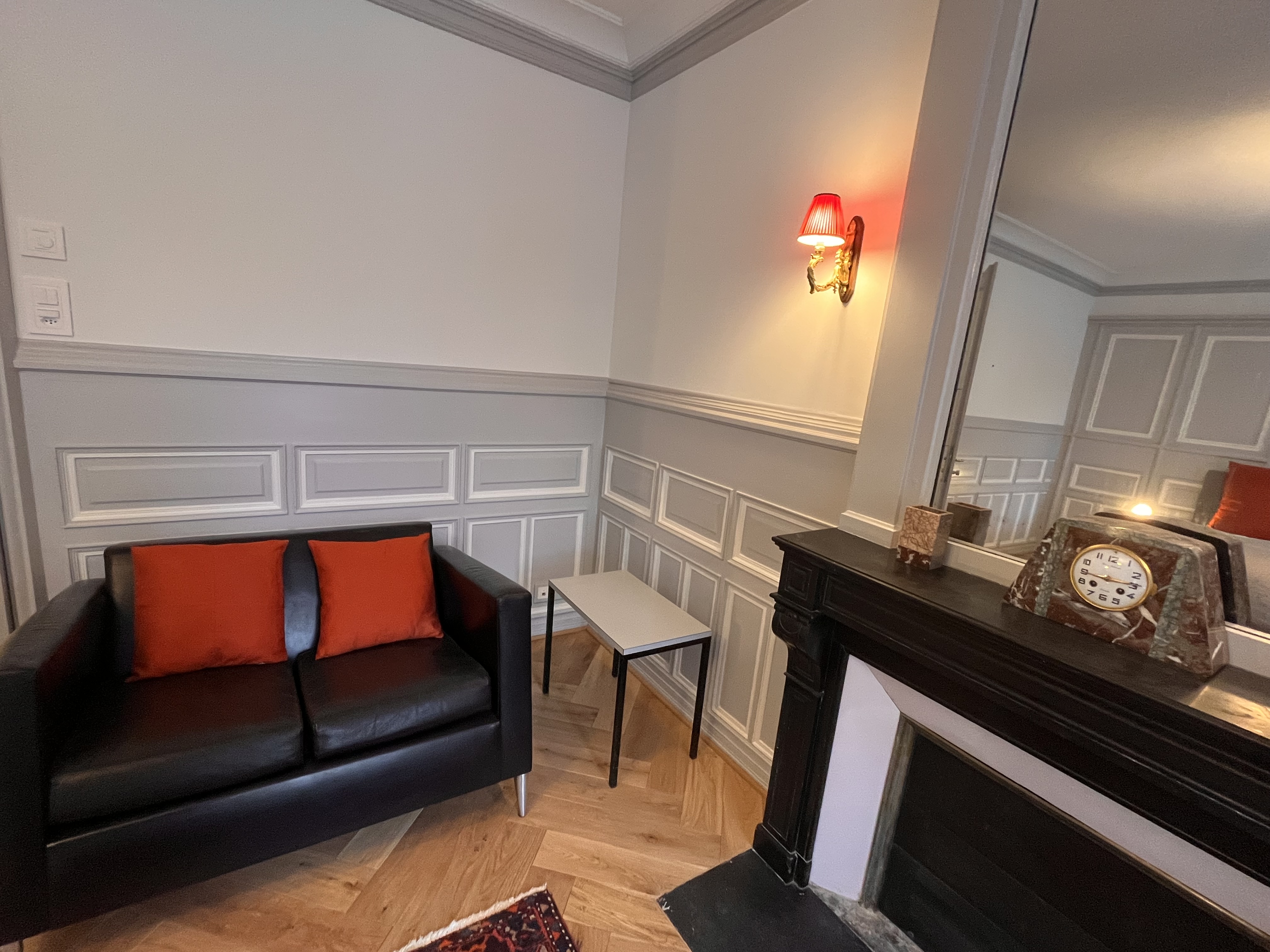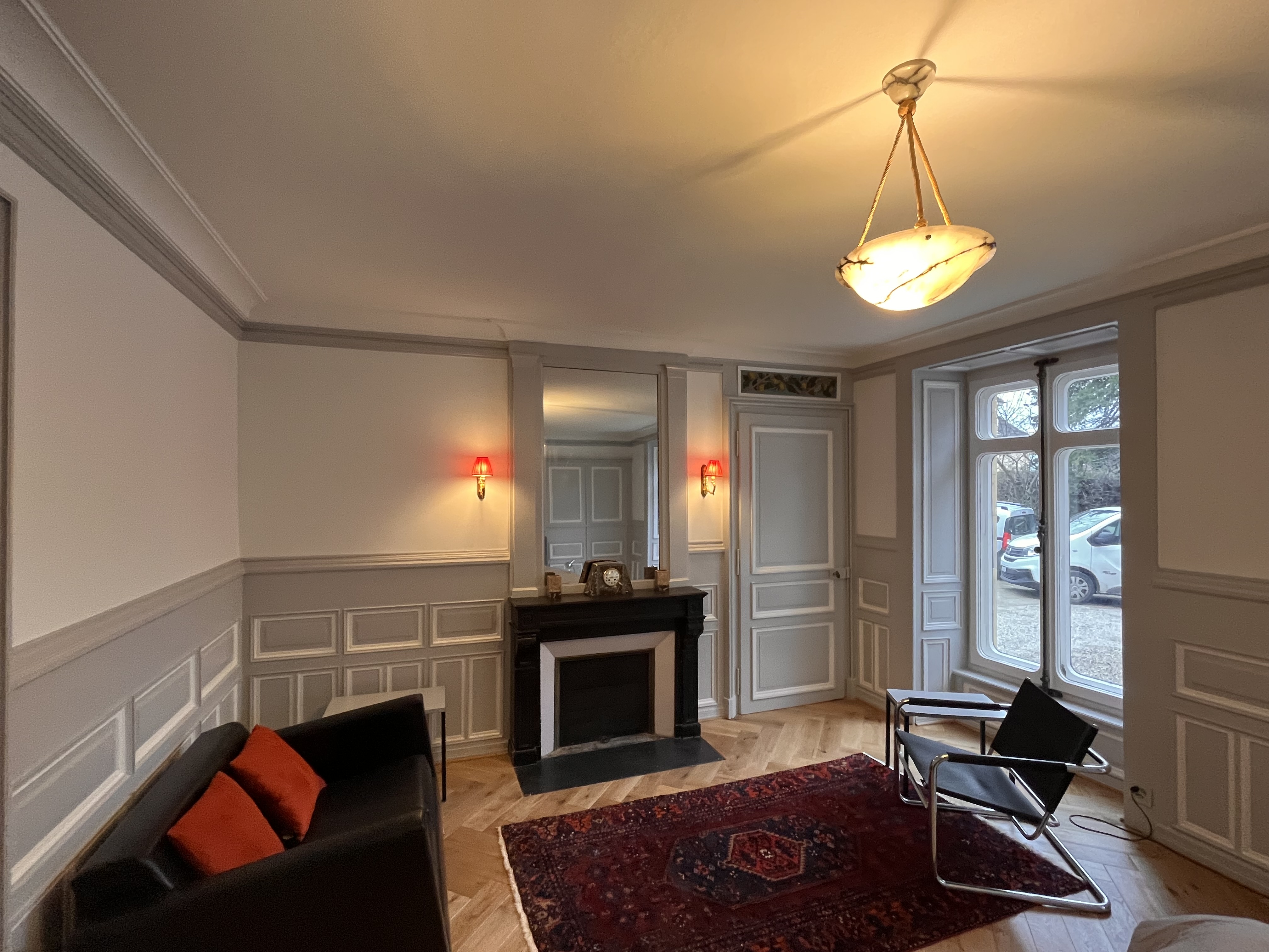 Cette chambre de 20m², aux impressionnantes boiseries décoratives est ornée de peintures d'origines. Une belle cheminée de marbre lui confère un charme d'époque, ses fenêtres lui confèrent une belle luminosité.